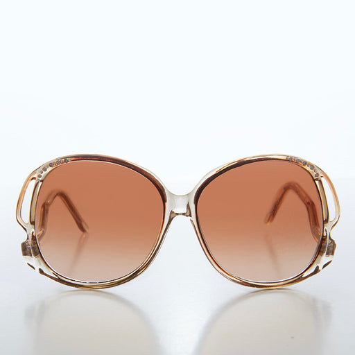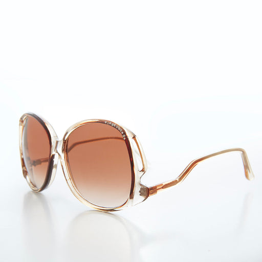 Be sure to glitter in this ultimate 80s sunglass. Featuring white rhinestone accents in each upper corner of this round, oversized frame and very r...