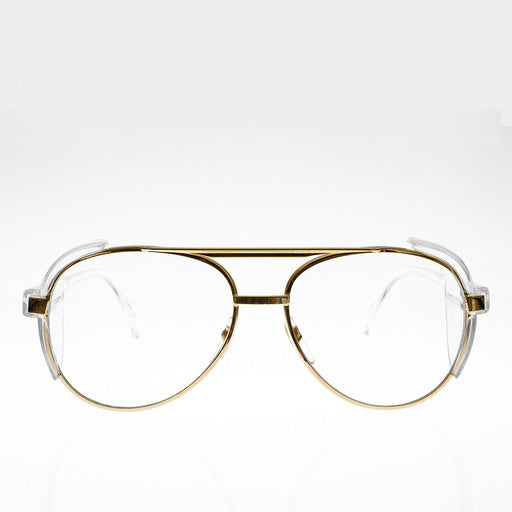 Vollständige Details anzeigenTeardrop, gold-rimmed, 90s safety glass, aviator with unique, clear temples and side shields. Wear them as a fashion statement, and or, for eye pro...