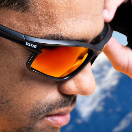 Discover superior clarity and style with the BEXST Iktomi Wraparound Sunglasses. Featuring a matte black TR90 frame with matte red tips, these sung...